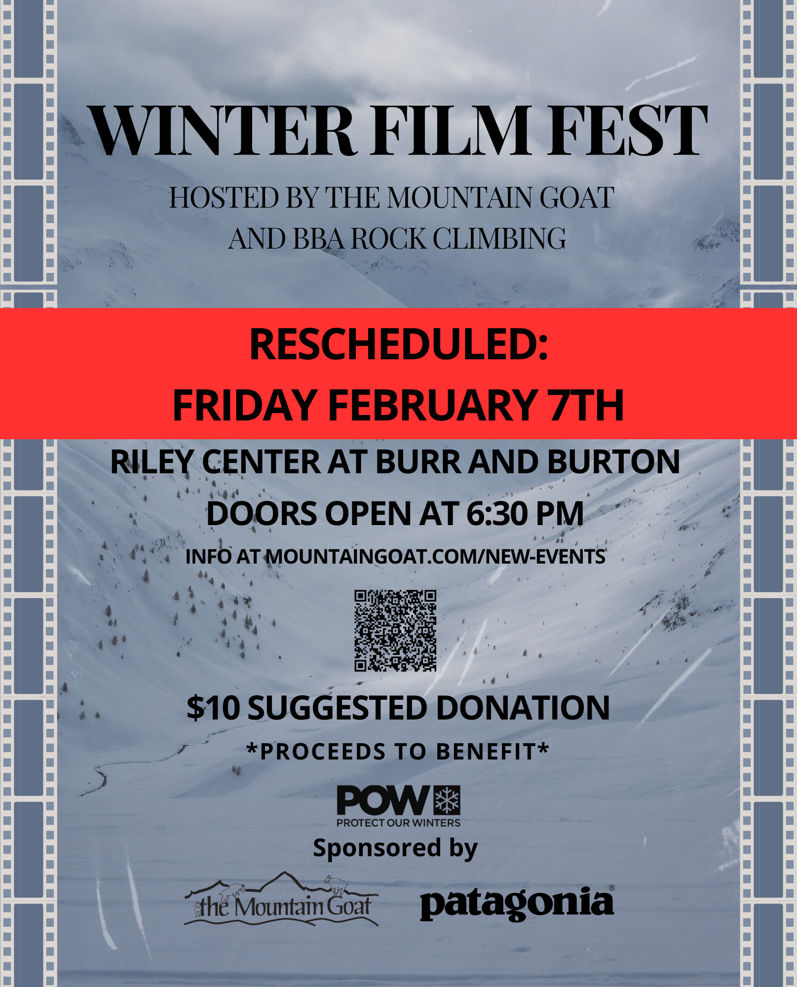 Come join us for our Annual Winter Film Festival presented by Patagonia and The Mountain Goat on February 7th at 7pm. Doors open at 6:30pm.